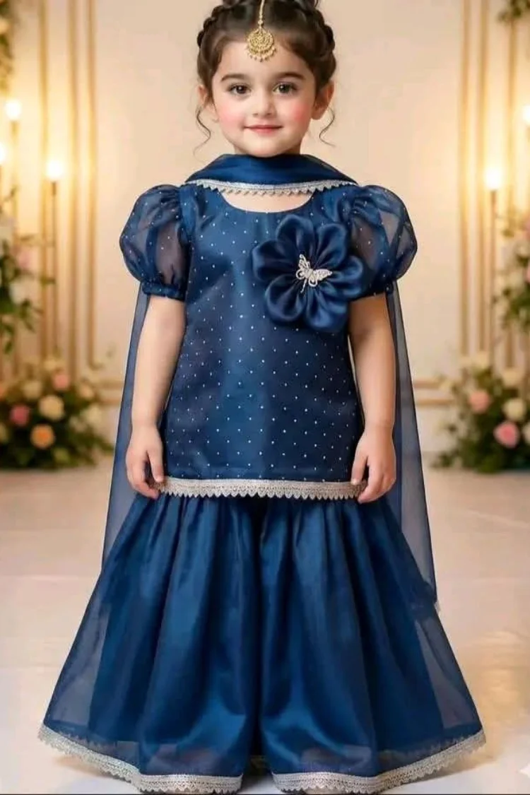 This stunning navy blue gown is crafted for grand celebrations. Featuring soft net layers and a statement floral embellishment, it creates a royal and graceful appearance perfect for formal events.