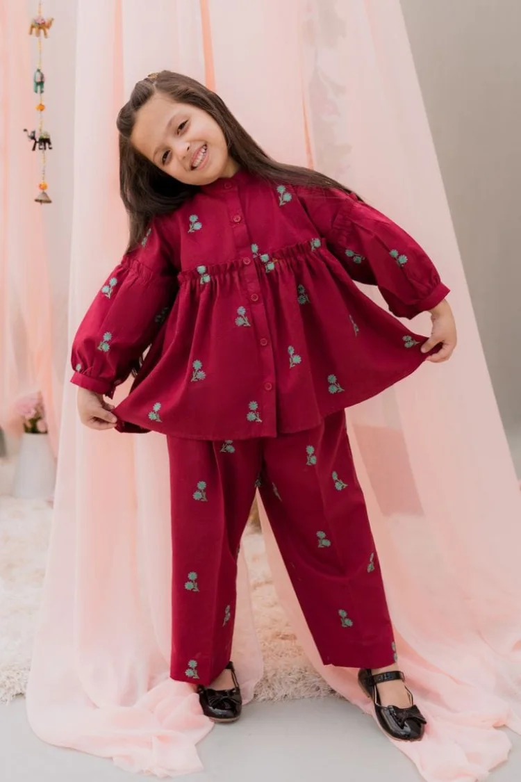 This stunning ruby red two-piece outfit features delicate floral embellishments that add grace and festive beauty. The flared frock-style kurta gives a princess-like look while allowing easy movement.